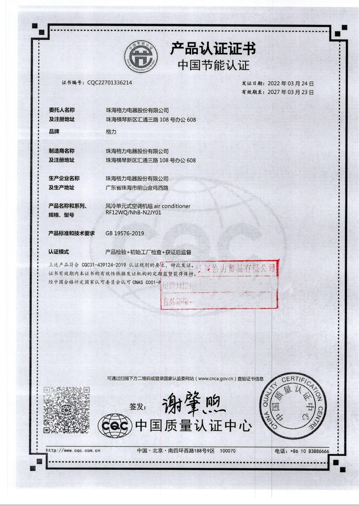 | 1 | 立式空调 | 1(台) | ¥12,500.00 | ¥12,500.00 | 产地:广东;包含连接管长度(铜管)(米):4;中国国家强制性产品认证证书扫描件:查看;中国国家强制性产品认证证书有效期:2025-07-06;中国国家强制性产品认证证书编号:2020010703308438;中国节能产品认证证书扫描件:查看;中国环境标志产品认证证书扫描件:查看;中国节能产品认证证书编号:CQC22701336214;中国节能产品认证证书有效期:2027-03-23;中国环境标志产品认证证书编号:CEC2018ELP00403209;中国环境标志产品认证证书有效期:2025-06-11;冷暖类型:冷暖;定频/变频:定频;匹数:大5P;能效等级(GB21455-2019):2级;能效等级:2级;控制方式:遥控,键控;扫风方式:上下扫风,左右扫风;适用面积:51-100㎡;室内机型号:RF12WQ/NhB-N2JY01;室外机型号:RF12WQ/NhB-N2JY01(0);全年能源消耗效率(APF):2.85;制冷季节能源消耗效率(SEER):2.85;制热季节性能系数(HSPF):2.99;能效比:2;制冷剂:R32;室外机防水等级:IPX4;制冷量(W):12010;制热量 |